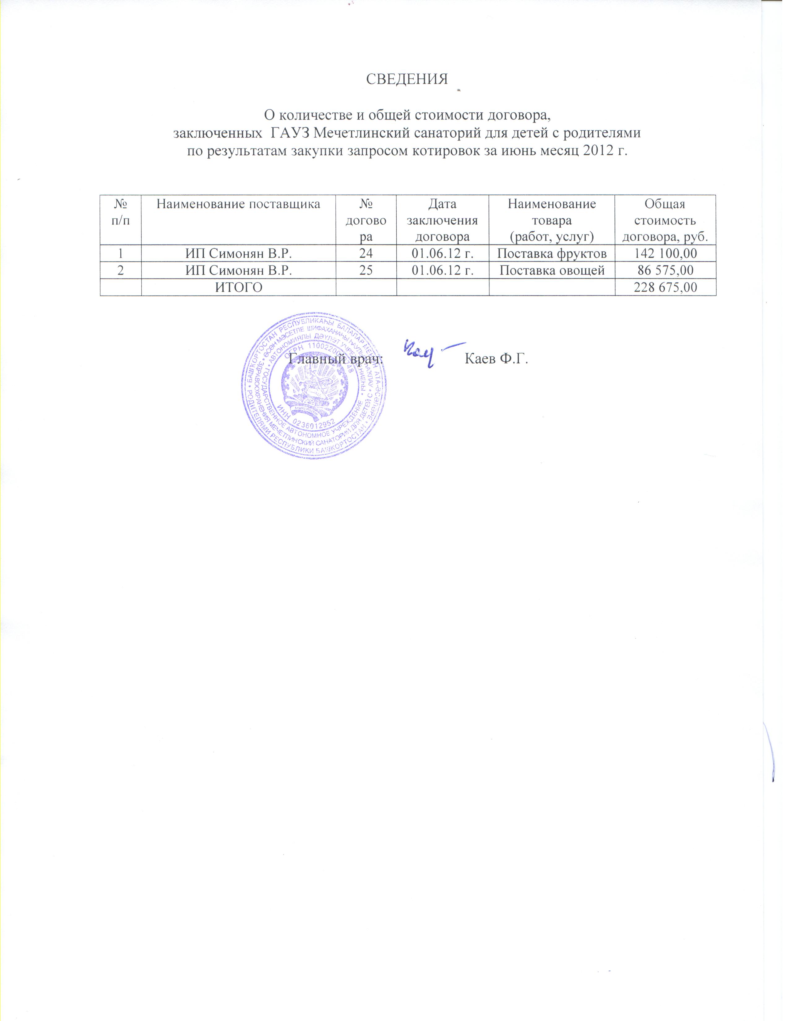 Сведения о количестве и общей стоимости договоров заключенных по результатам закупки запросом котировок за июнь овощи и фрукты