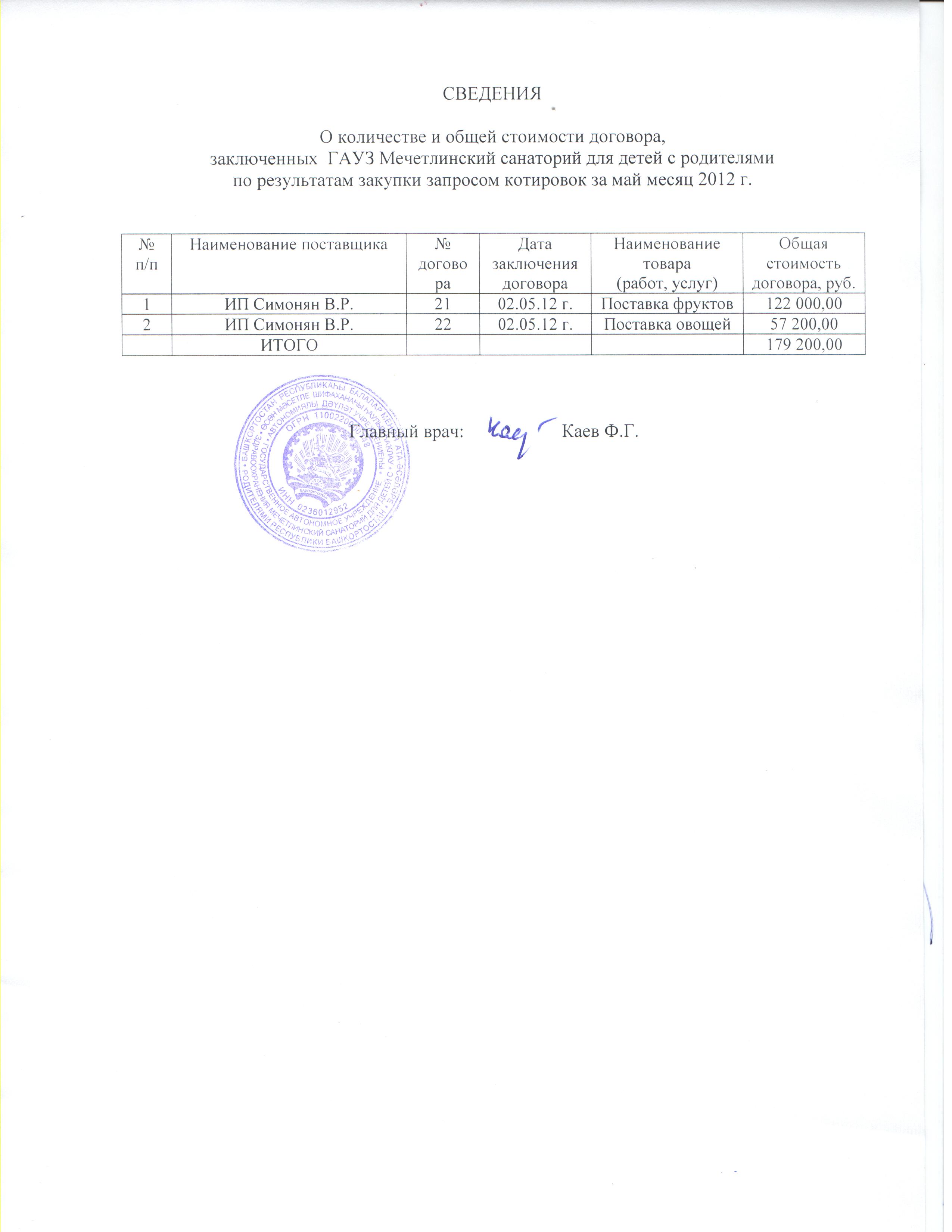 Сведения о количестве и общей стоимости договоров заключенных по результатам закупки запросом котировок за май овощи и фрукты
